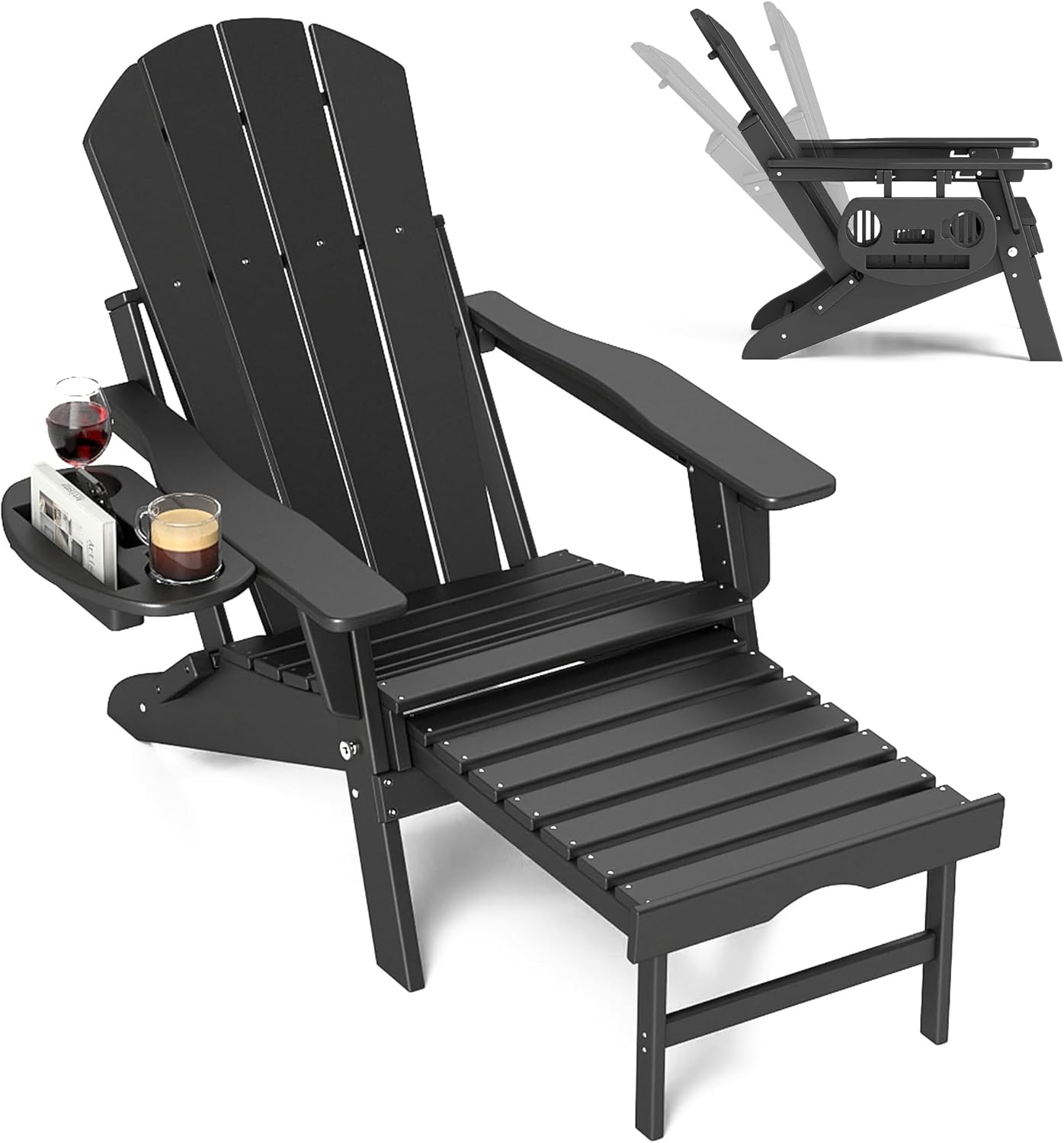 Our Adirondack chair has a built-in 22-inch retractable footrest that provides excellent support for your feet. When you don't need it, simply retract the footrest and hide it under the seat. Overall dimensions are 51" L x 30" W x 36" H, its oversized design perfectly fits most body shape.
